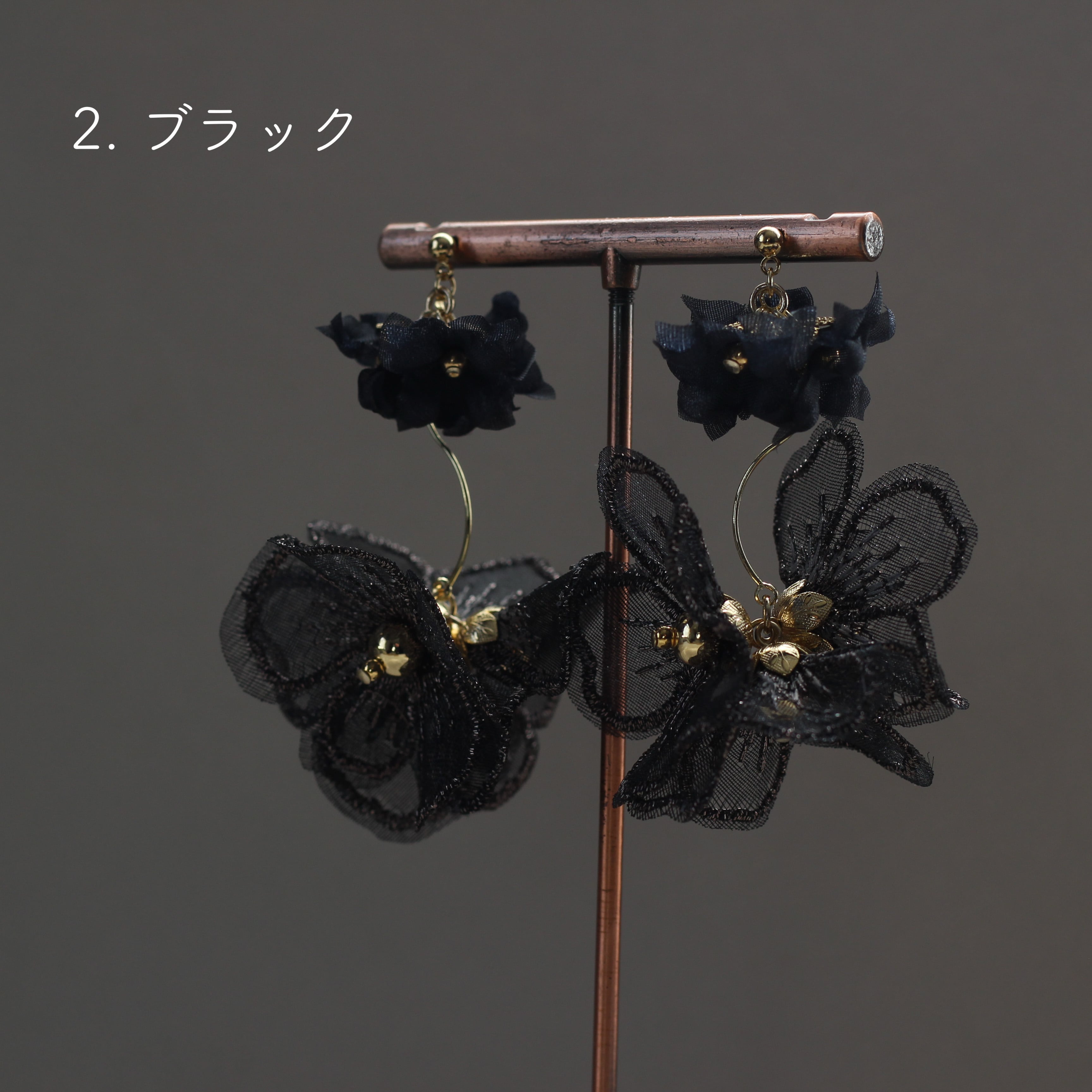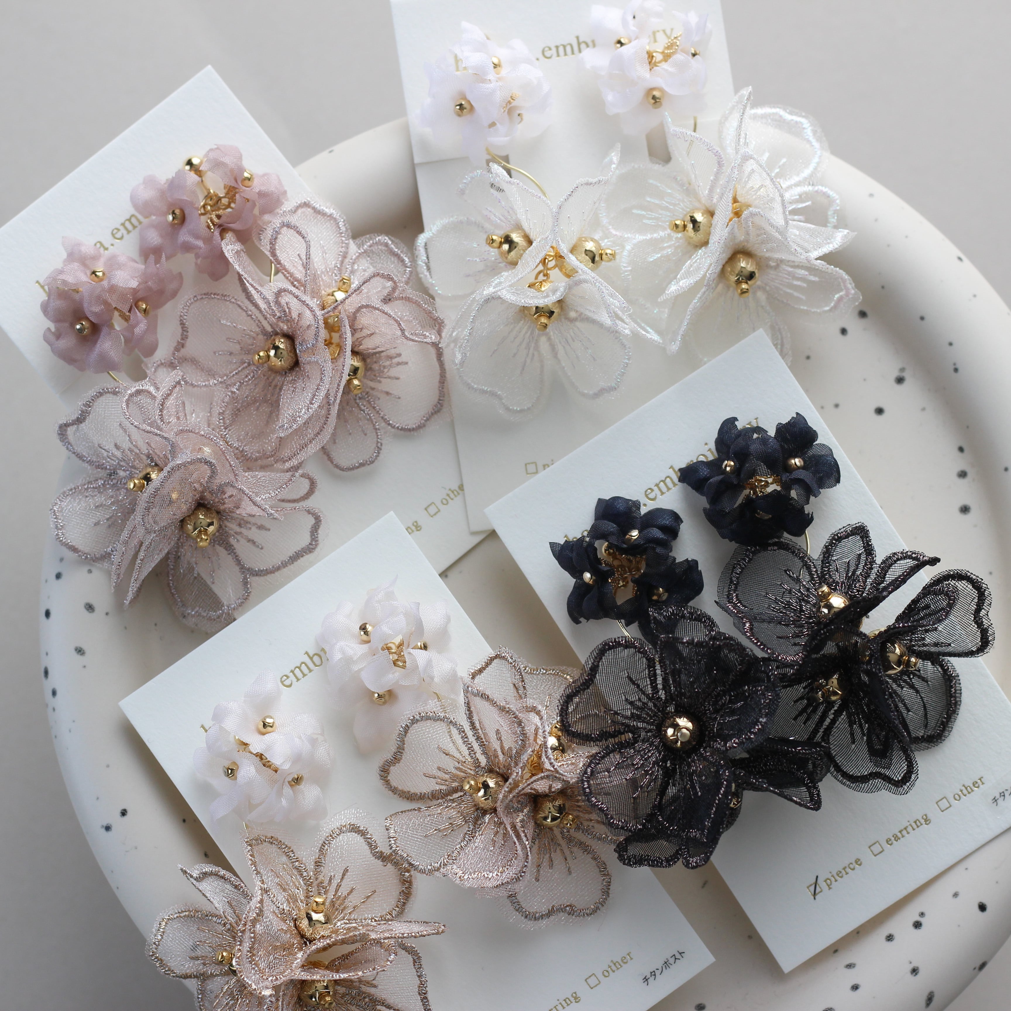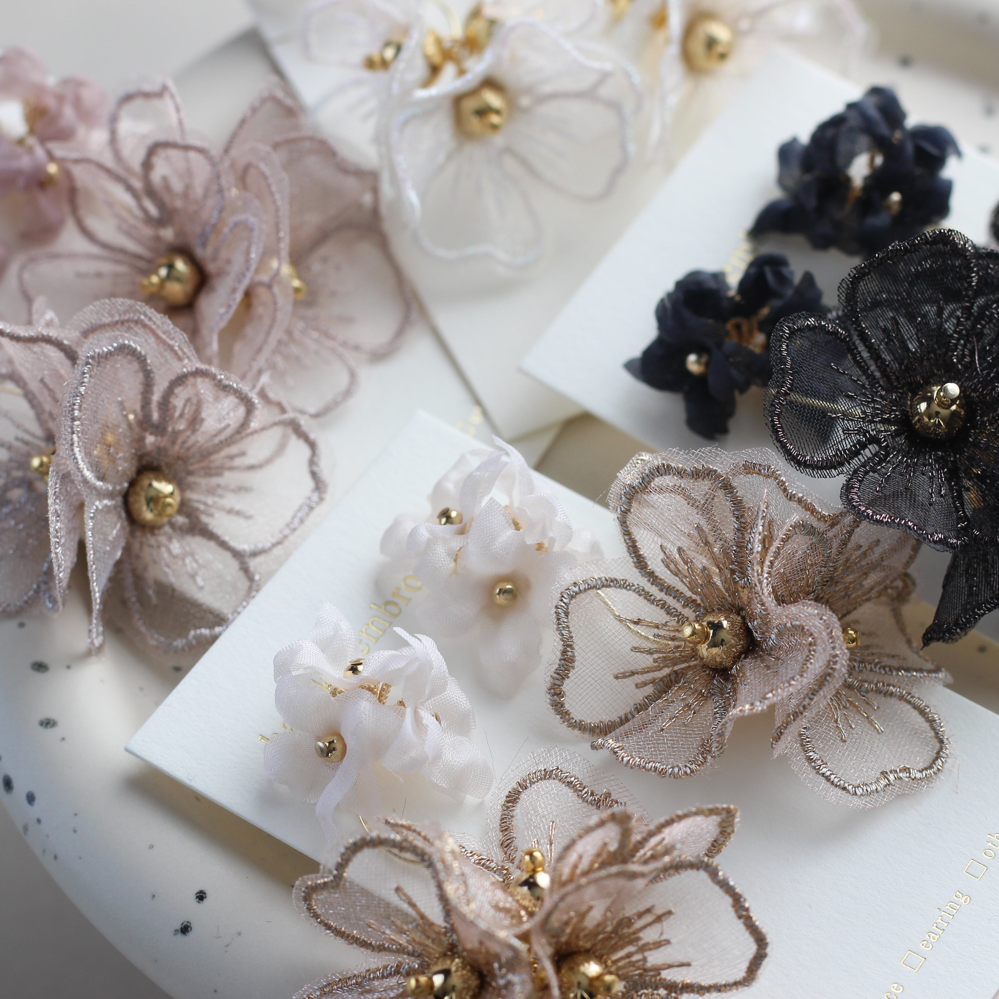 ・他のアクセサリーと一緒に収納すると、他のアクセサリーの金具やパーツが引っかかることで、お花パーツが変形したりしてしまう場合があります。そのため作品の保管は、個別にすることをおすすめします。